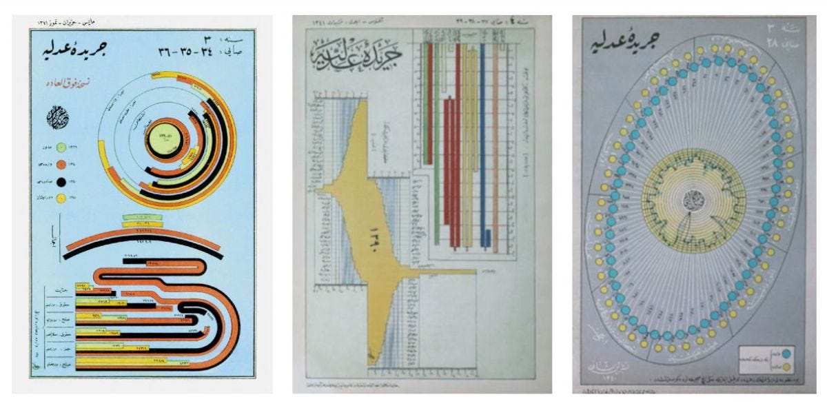 Thanks goes to Deniz Cem Önduygu (Twitter) for introducing me to Cerîde-i Adliye. He contributed to a collection of animated rendition of these graphics for an exhibit titled Speak to the Eyes (website).
