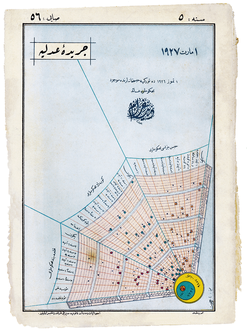 Cerîde-i Adliye (Journal of Justice) was published out of Istanbul from about 1924–27. The chart shown below is from the cover of issue 56. It depicts the numbers of convicts held in Turkish prisons as of June 1926, organized according to the sentence length and type. Prisoners trapped in the spider web of incarceration still rings true, almost 100 years later.