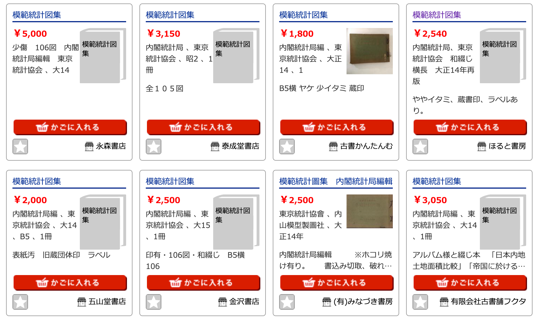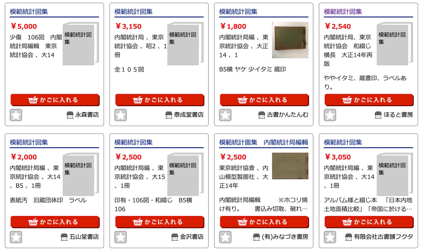 I was staring at a Kosho listing for a 1925 volume called 模範統計図集 [Model Statistical Illustration Collection]. Kosho is Japan’s immense online antiquarian marketplace. It is not one shop but a network: many dealers, many standards, one sprawling catalog. The depth is astonishing. The presentation can be maddening.
