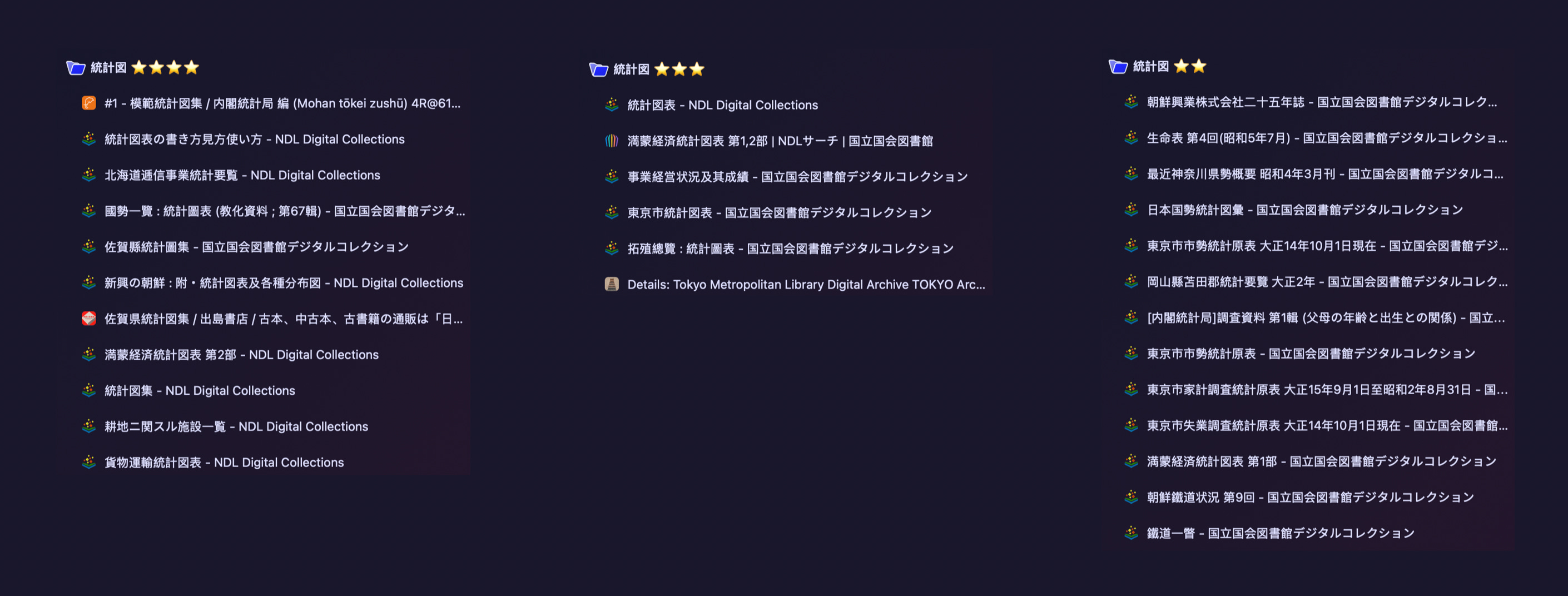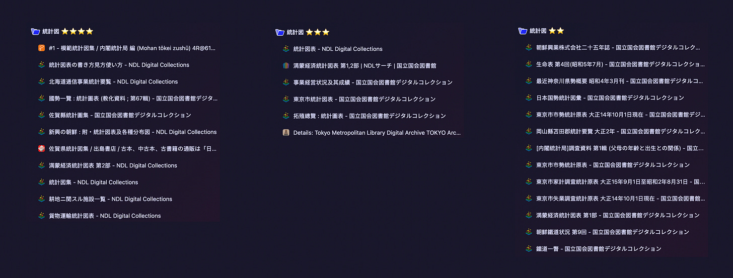 Once I sensed that world—1920s Japanese charts—I wanted a system for judging it. I began sorting discoveries into starred folders based on digitized copies. Four stars meant the full package: mostly graphics, color, and designs that felt strange, special, or sophisticated. Three stars meant serious promise. Lower stars could still contain interesting material, but not enough to make the object irresistible.