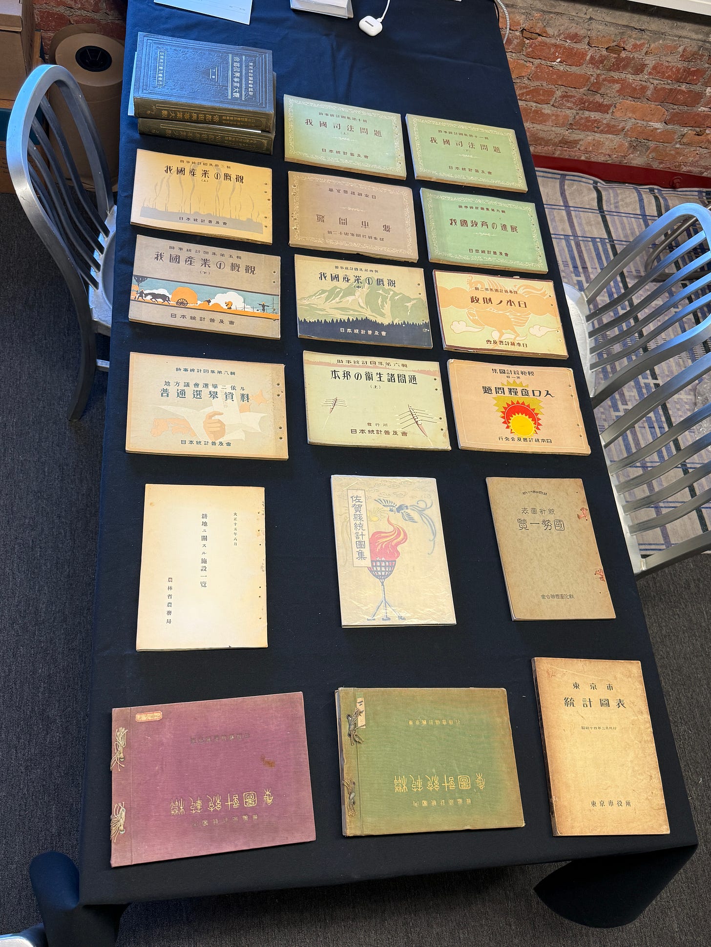 That is the feeling I have now, surrounded by these Japanese statistical books. Not completion. Not triumph. Something more unstable and more exciting: possibility. The near-complete run of Current Affairs Statistical Atlas alone could keep me busy for months. And the larger payoff still astonishes me. After tracing the growth of Japanese statistical graphics through the 1920s, through reconstruction, efficiency, municipal ambition, and bureaucratic self-education, I ended up holding the Comprehensive Overview of the Imperial Capital Reconstruction Project, a 1931 monumental two-volume work on rebuilding Tokyo after the Great Kantō Earthquake of 1923. That’s the same catastrophe that seems to have helped accelerate Japan’s appetite for visual statistical explanation. It’s packed with foldout charts and maps across two handsome volumes.