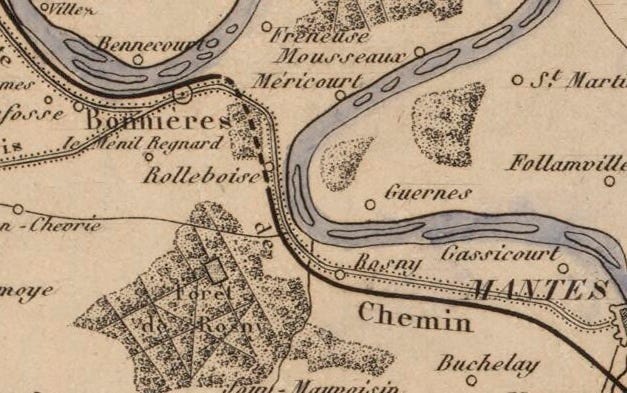 The dark horizontal bands represent tunnels. For example, the top band occurs just above Bonnières. It’s the 2,600m (1.6 miles) Tunnel de Rolleboise, which opened in 1843. You can see it on this period map of the Paris-Rouen line as a dashed line.