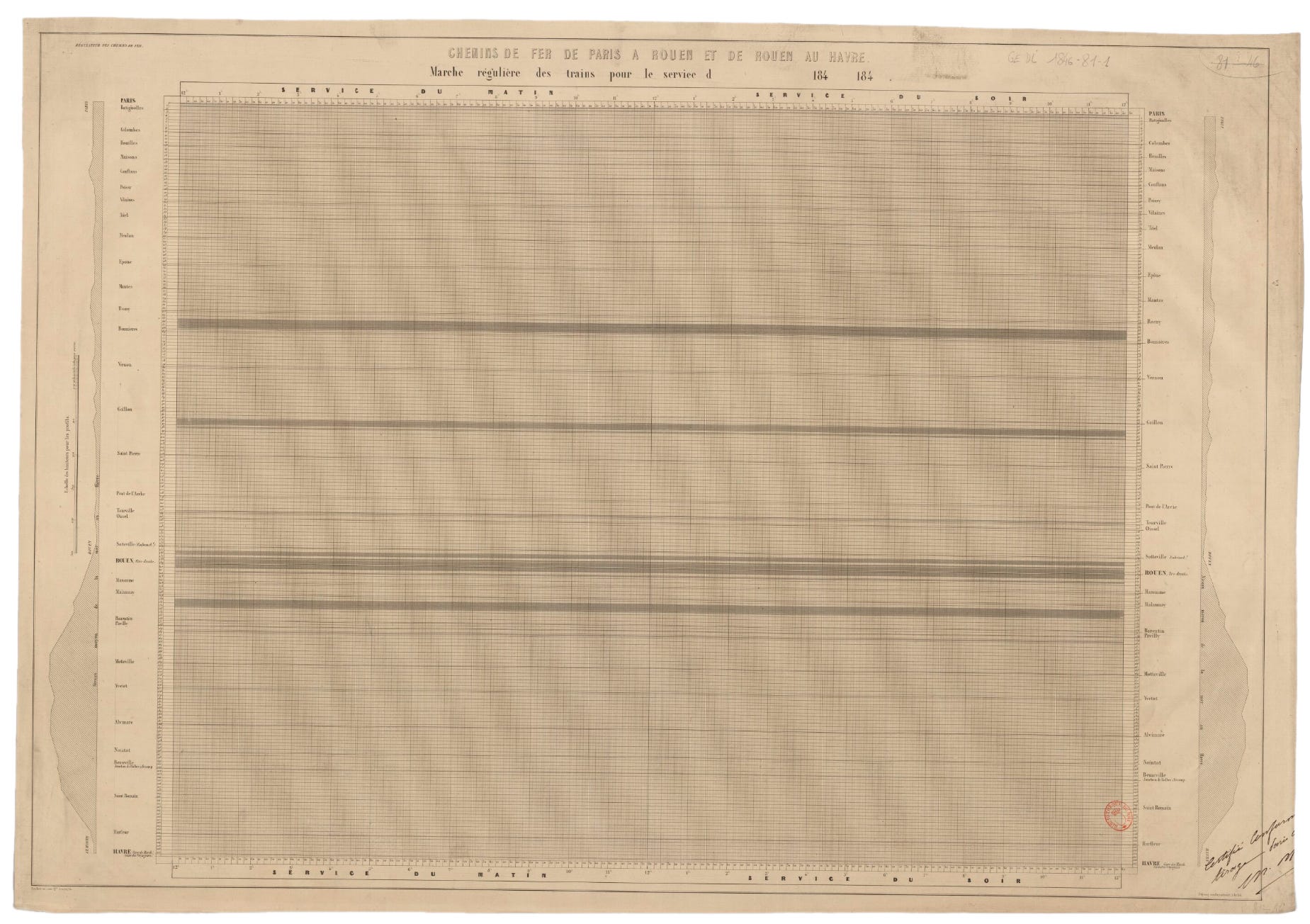 The Bibliothèque nationale de France holds two early blank diagrams, one with Ibry’s name on the bottom. They are labeled with the diagram’s name: RÉGULATEUR DES CHEMINS DE FER. Railway regulator. These extant templates are still waiting to be inserted into the machine and have their trains plotted.