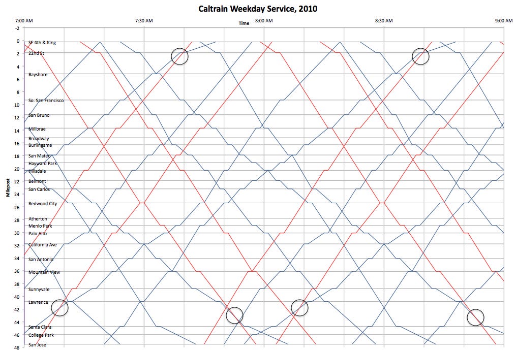 To our passenger’s eye, the Caltrain diagram is a fascinating novelty. Curious, but not as helpful to catch a train as a simple timetable. Petiet’s diagram, however, was not invented for passengers.