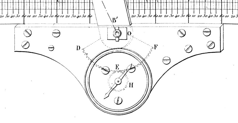 The speed-indicating needle (H) at the bottom of the sliding ruler (B’) is geared (DEF) to turn with the ruler’s angle. This enabled an engineer to fix the ruler’s slope to a particular speed and then plot the train’s path.
