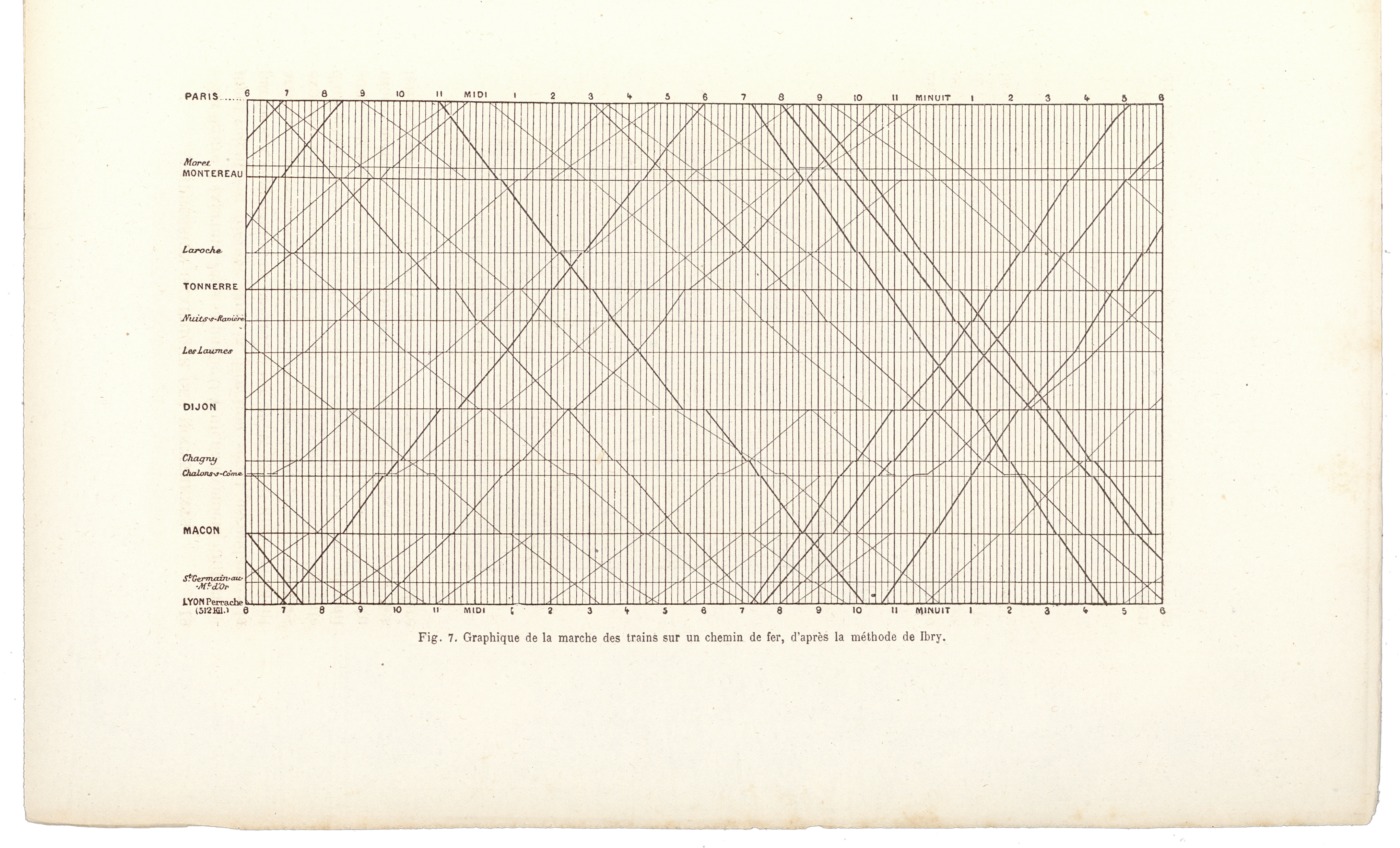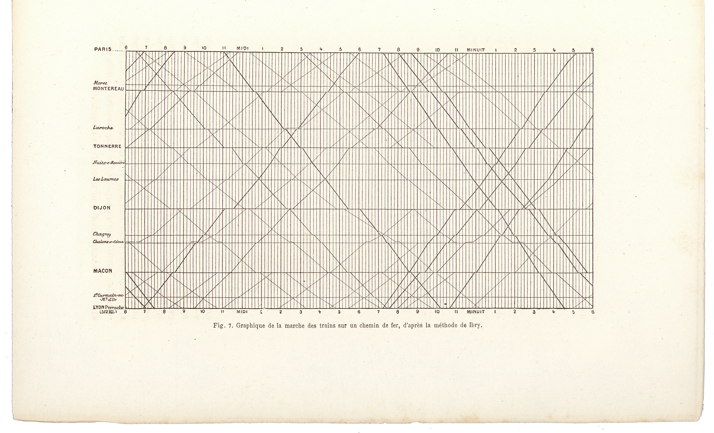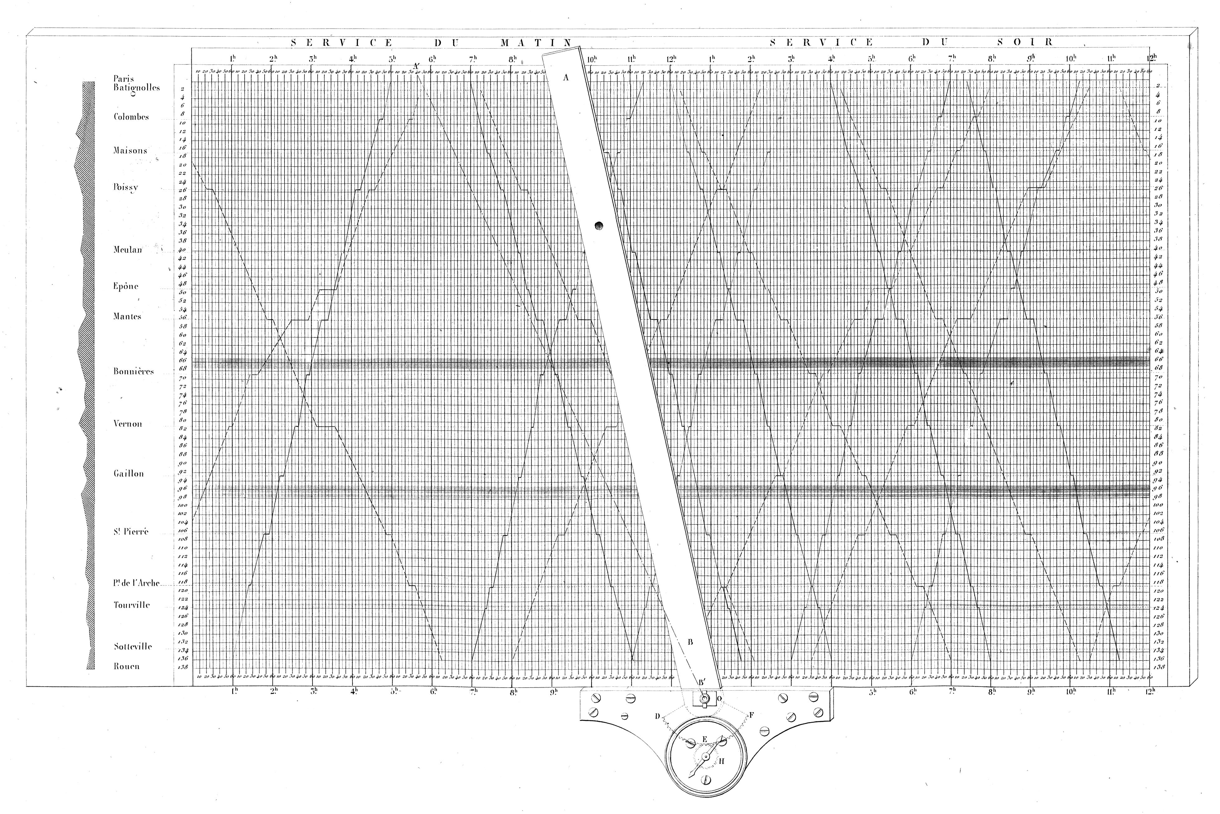 Petiet’s original graphic method was immediately put into use by Jacques Alphonse Busche on northern railway lines. It was also picked up by Charles Ibry, deputy chief operating officer of the railway from Paris to Rouen. (On some documents, Ibry is spelled Ybry.)