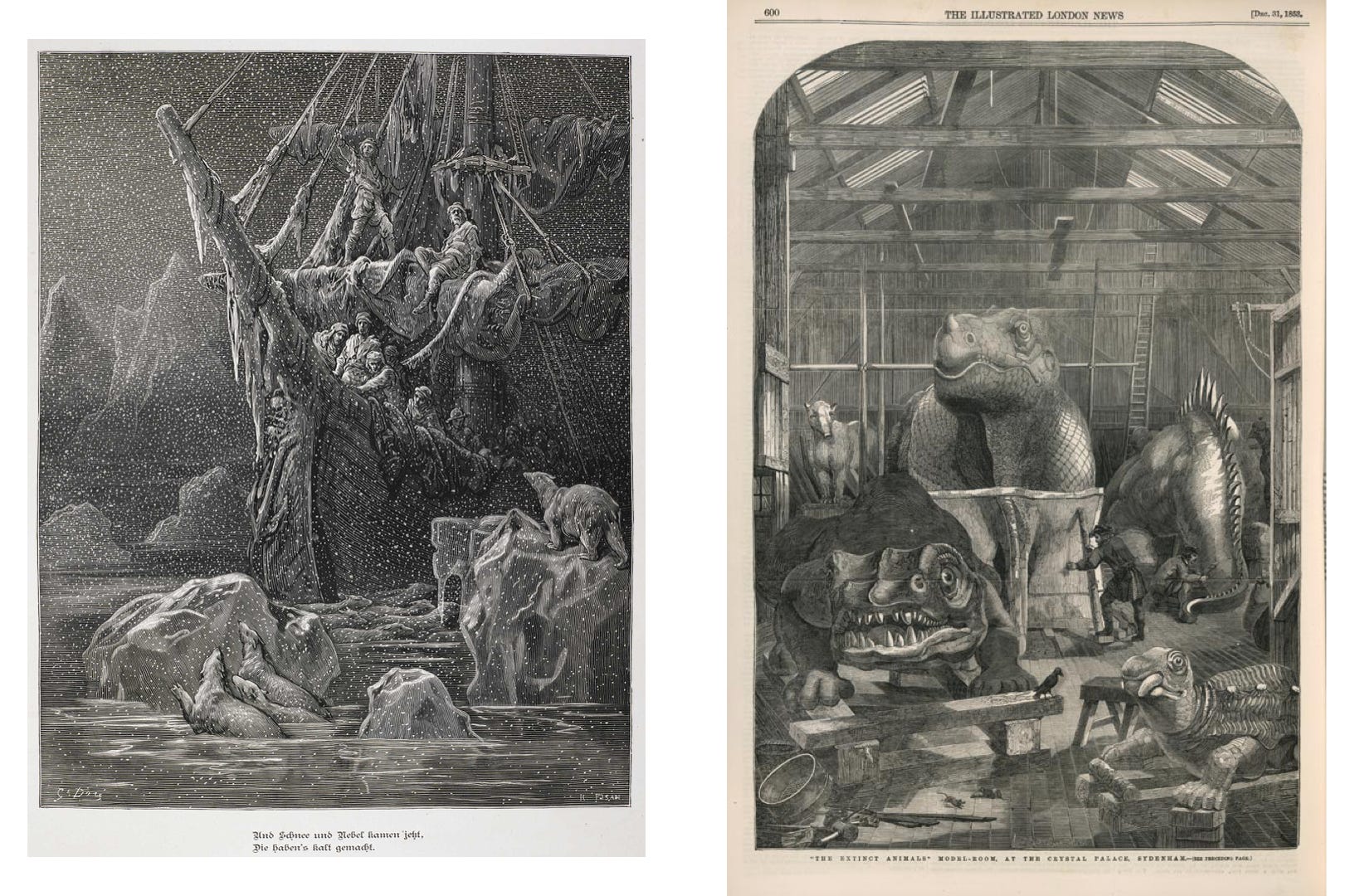 Gustave Doré, The Rime of the Ancient Mariner (1877) | Illustrated London News, Benjamin Waterhouse Hawkins' studio where he made the Crystal Palace dinosaur (1853)