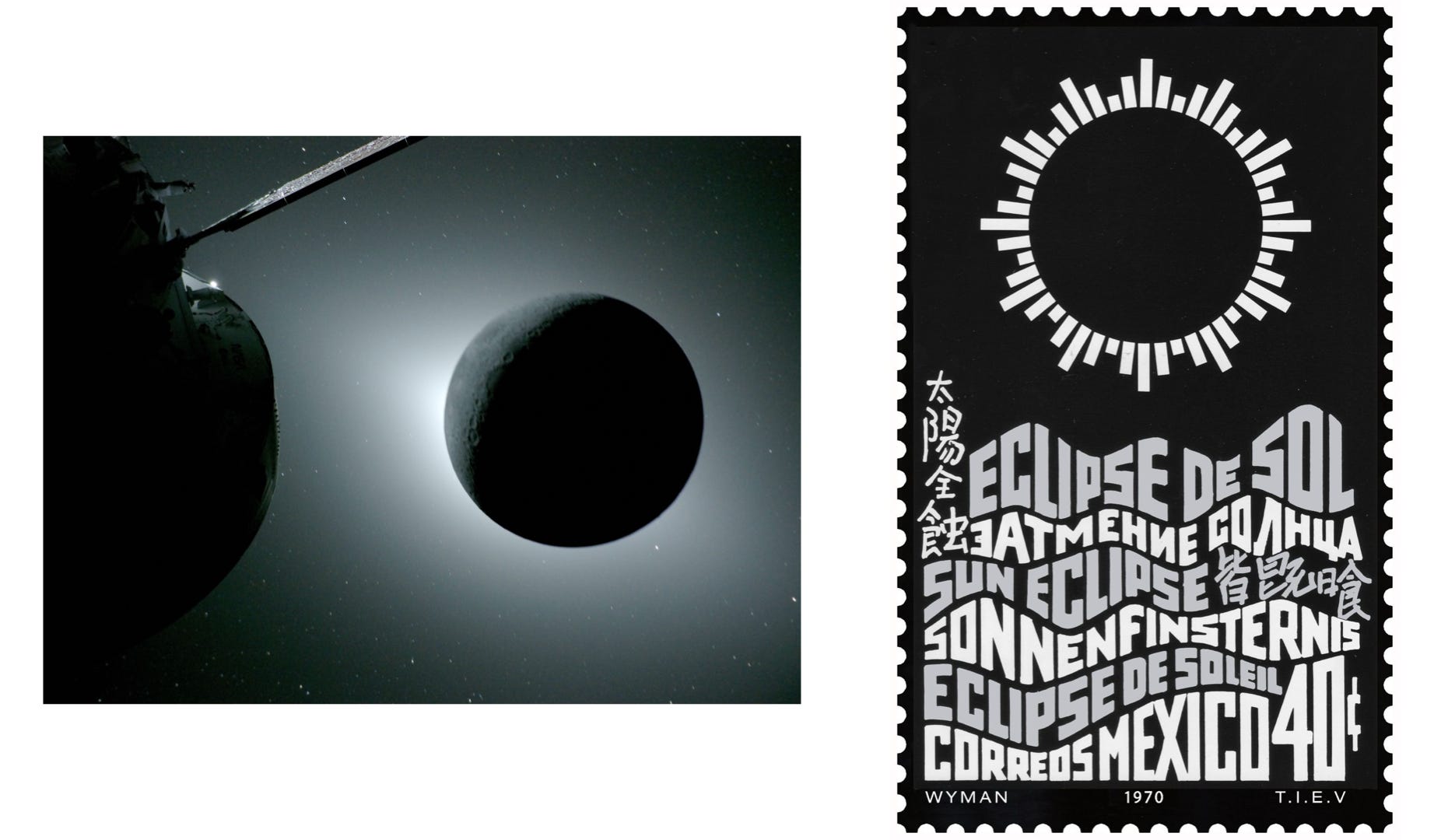 NASA, Orion, Moon backlit by the Sun (2026) | Lance Wyman, eclipse stamp (1970)