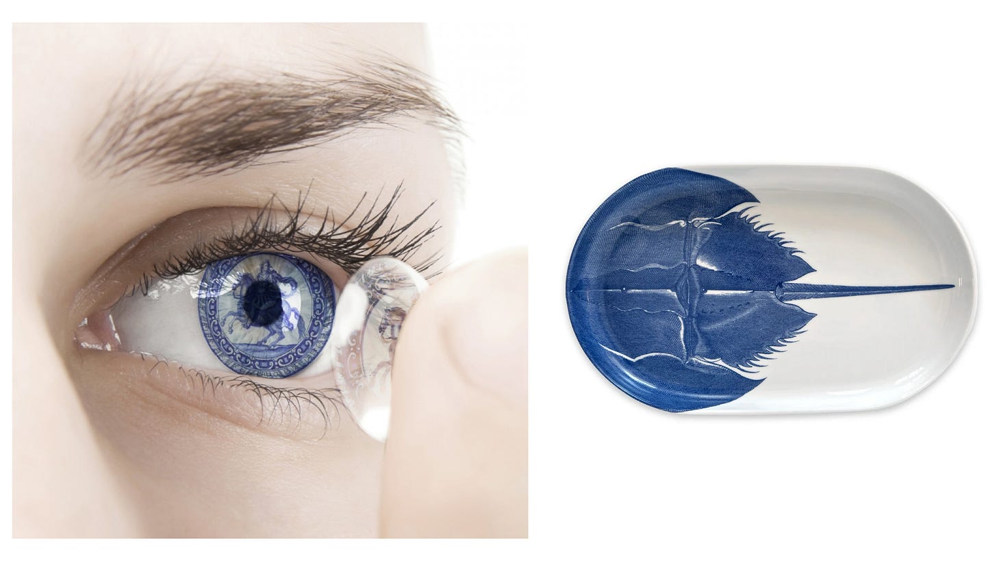 Francine LeClerq and Ali Soltani, Delft Blue Eyes + Nails | Caskata, HorseshoeCrab platter