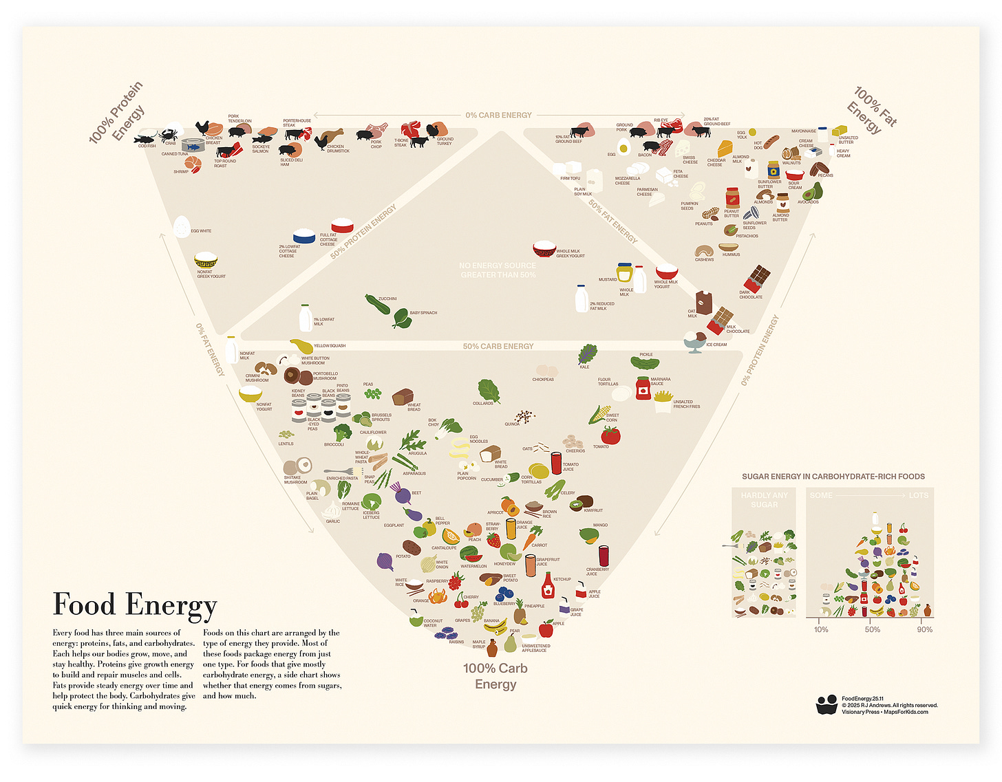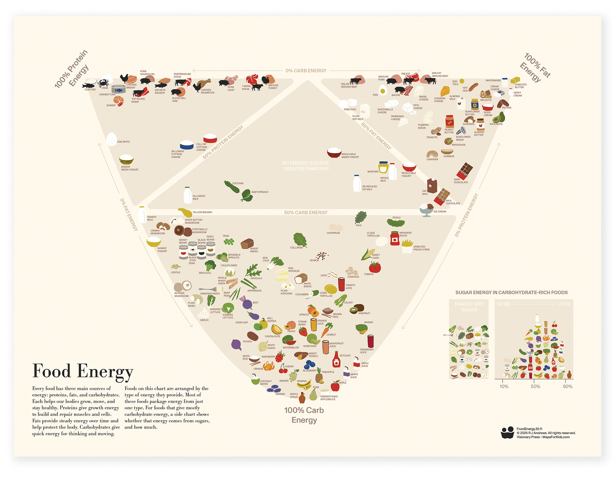 Food Energy arranges familiar snacks and ingredients into a colorful wall chart. 146 foundation foods are placed by how much of their energy comes from fats, proteins, or carbohydrates, so kids can literally see the difference between an avocado, a yogurt, and a bowl of rice.
