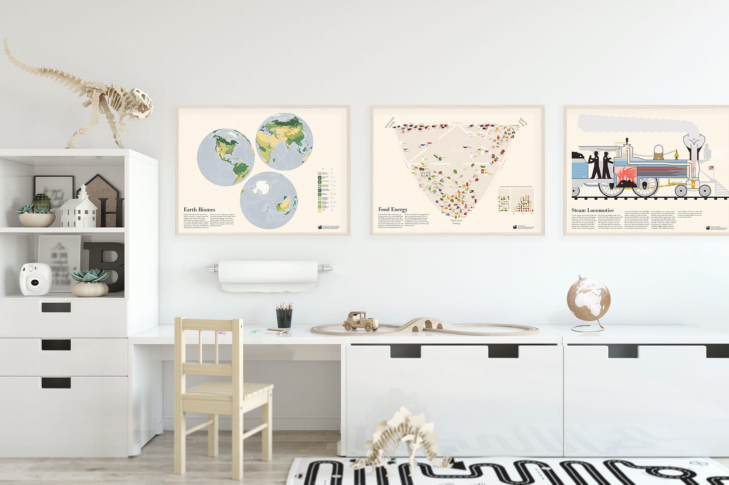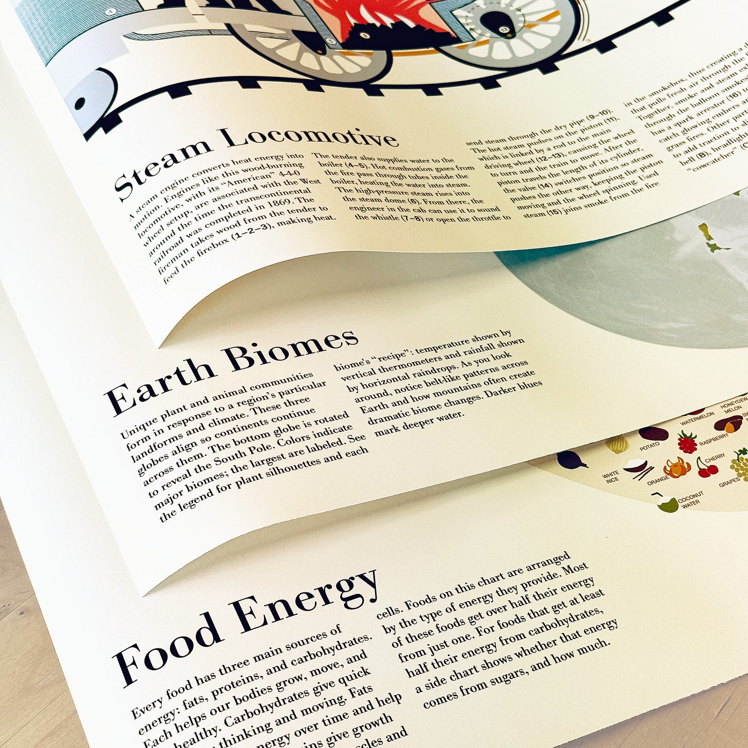 The three-poster package is a balanced introduction to information graphics: one diagram, one chart, one map. Steam, snacks, and the whole planet—a tiny gallery of how we can map different kinds of knowledge.