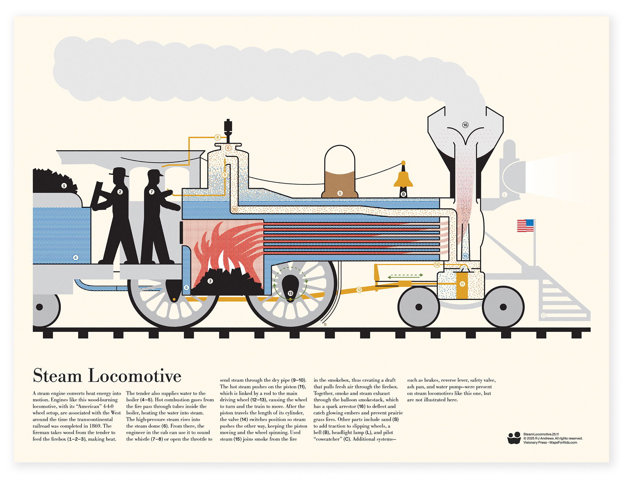 “Steam Locomotive” tells the story of a classic wood-burning 4-4-0 engine—the kind that helped stitch the United States together in the 19th century. The engine stretches across the page like a mechanical animal, every major system illustrated and explained.