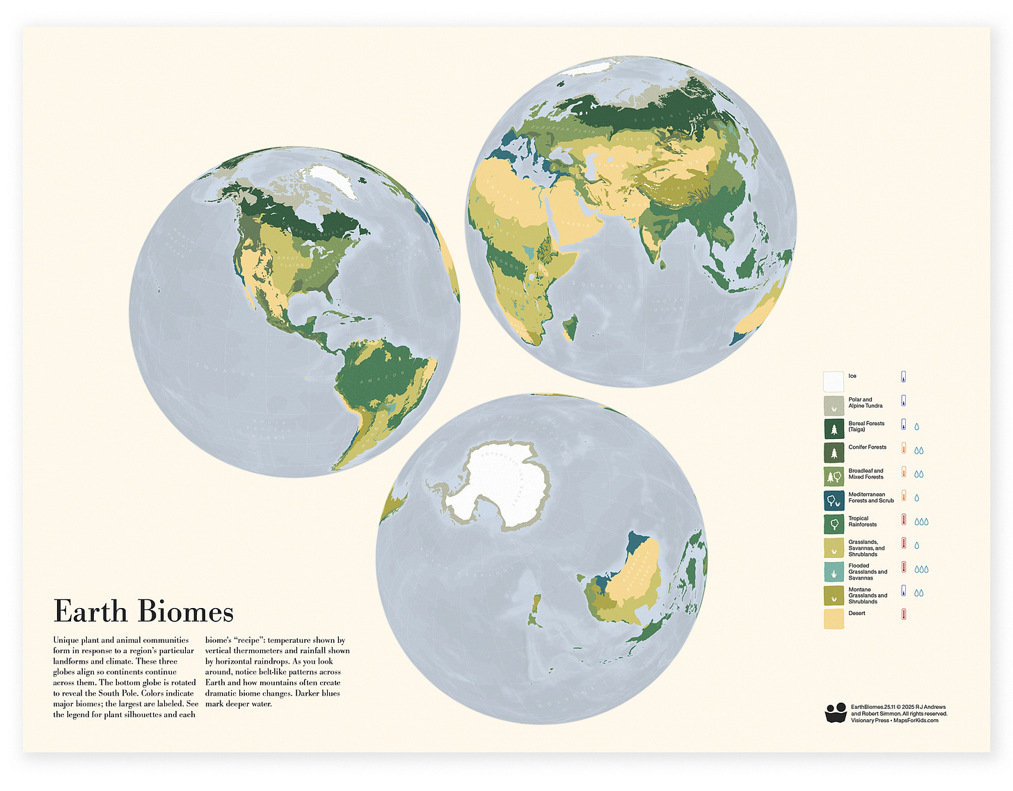 “Earth Biomes” is an illustrated wall map built from three globes. They line up so continents continue across them, with the bottom globe flipped to reveal the South Pole. Color washes across the land to mark major biomes—rainforests, deserts, tundras, and more—while ocean blues darken to show where the water runs deep.