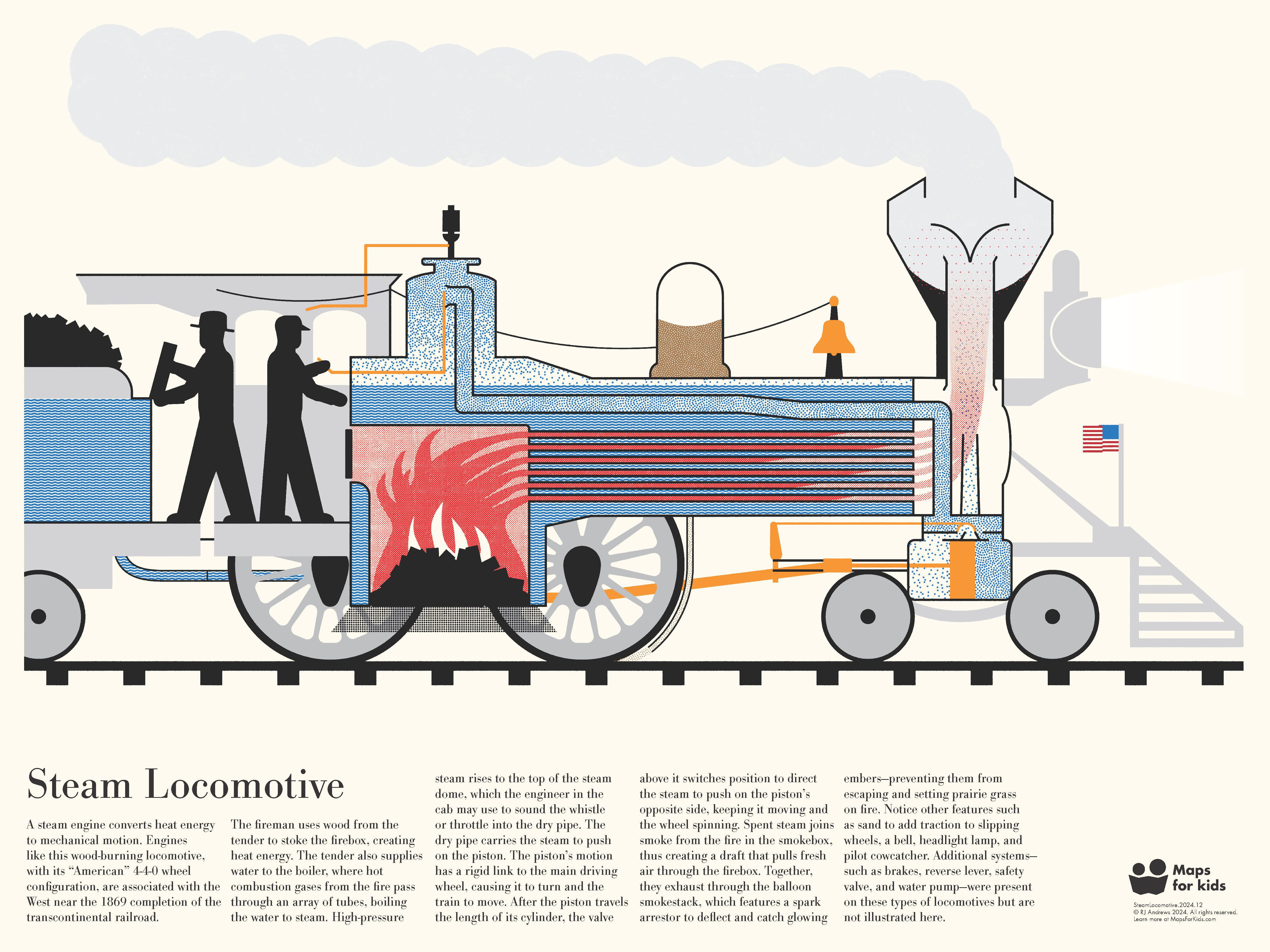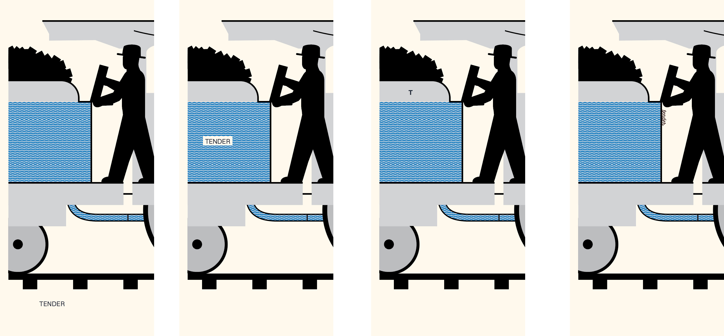 For the steam locomotive, I've tried a swim lane of labels beneath the diagram, direct labels, capital letters keyed to the descriptive text [ tender (T) ], and cursive text hidden in the line art.