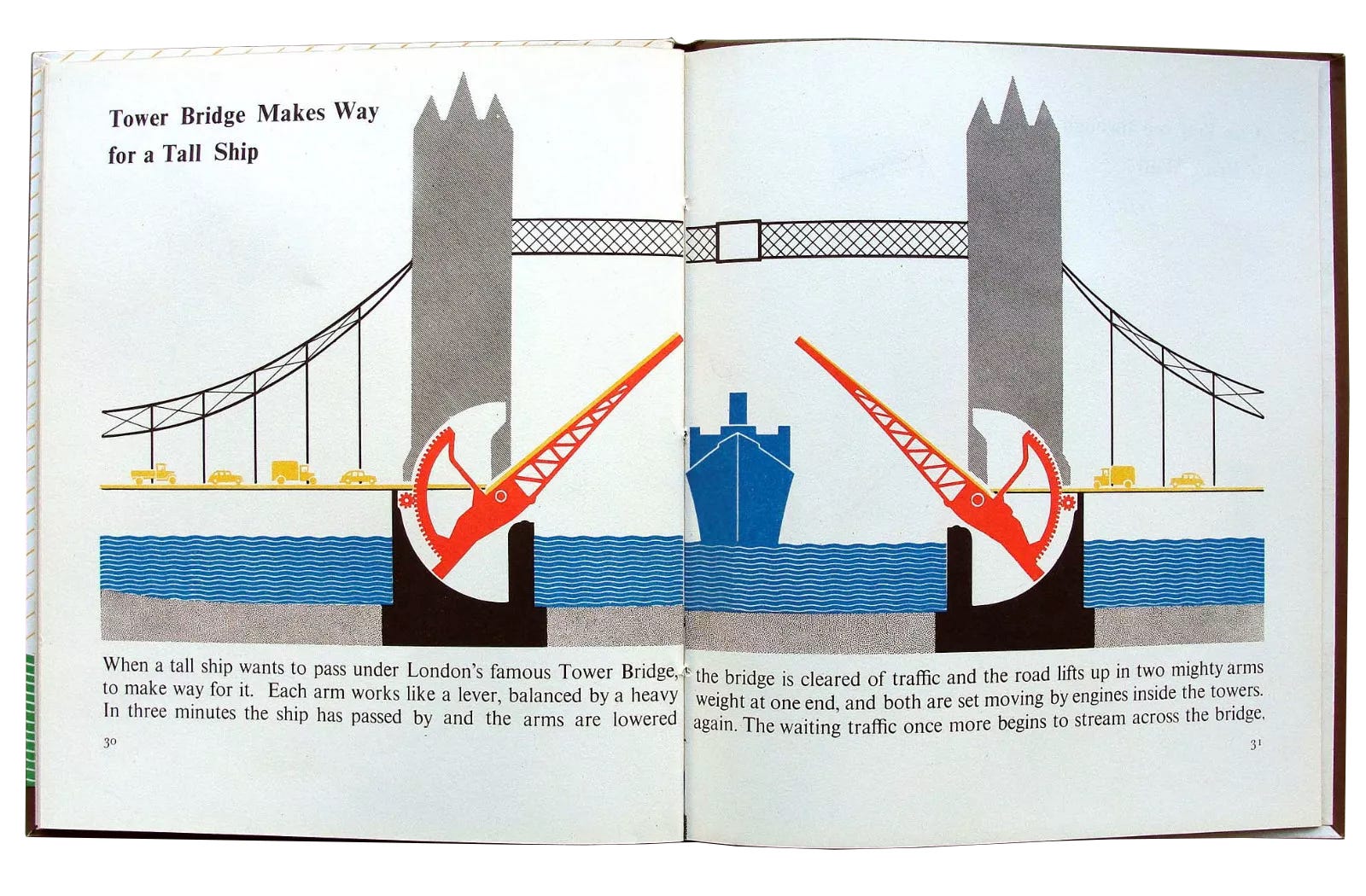 Do we even need labels? Most of Marie Neurath’s work for children are pure illustration. For example, here’s her Tower Bridge from I’ll Show You How it Happens (1948).