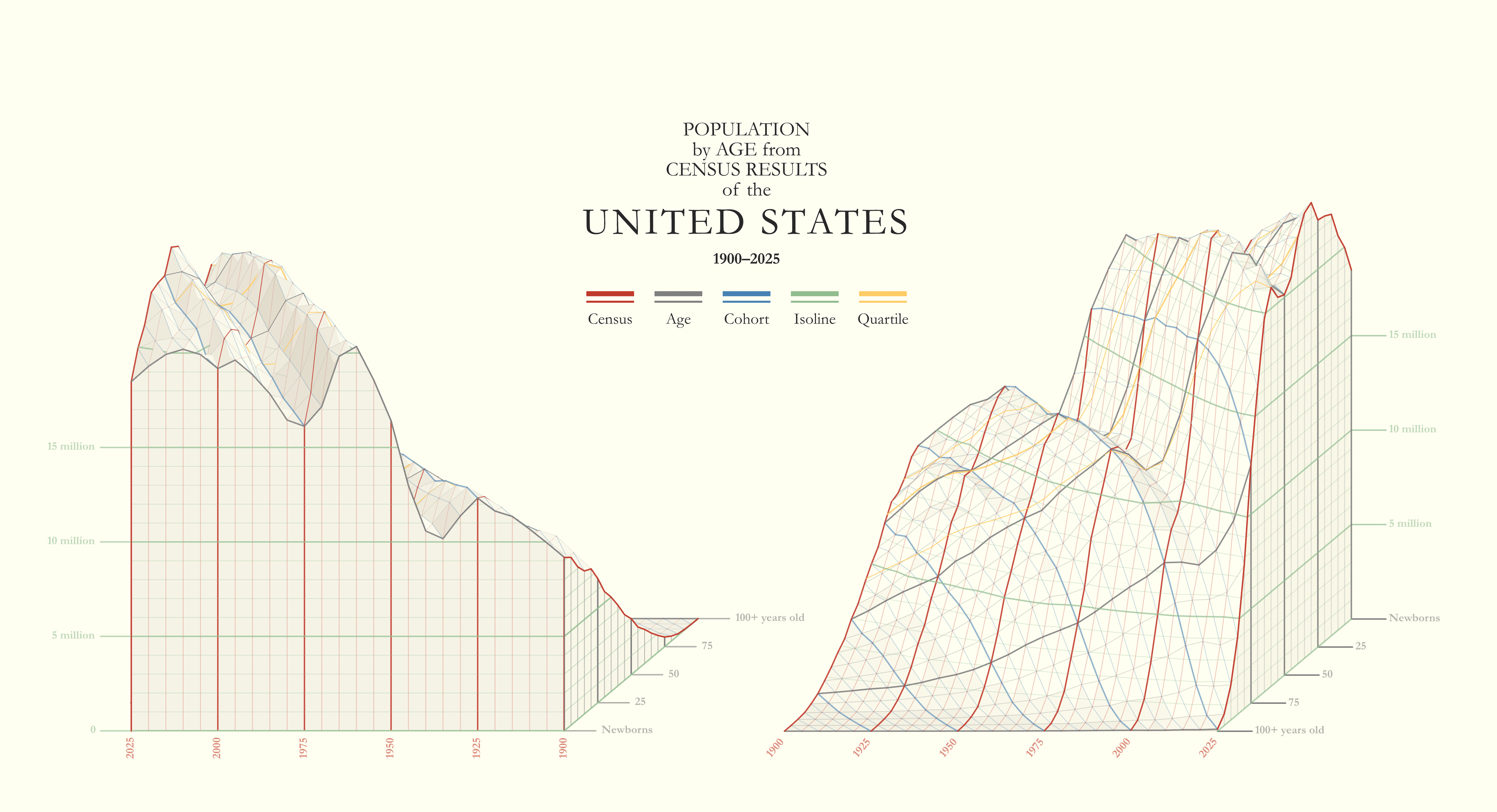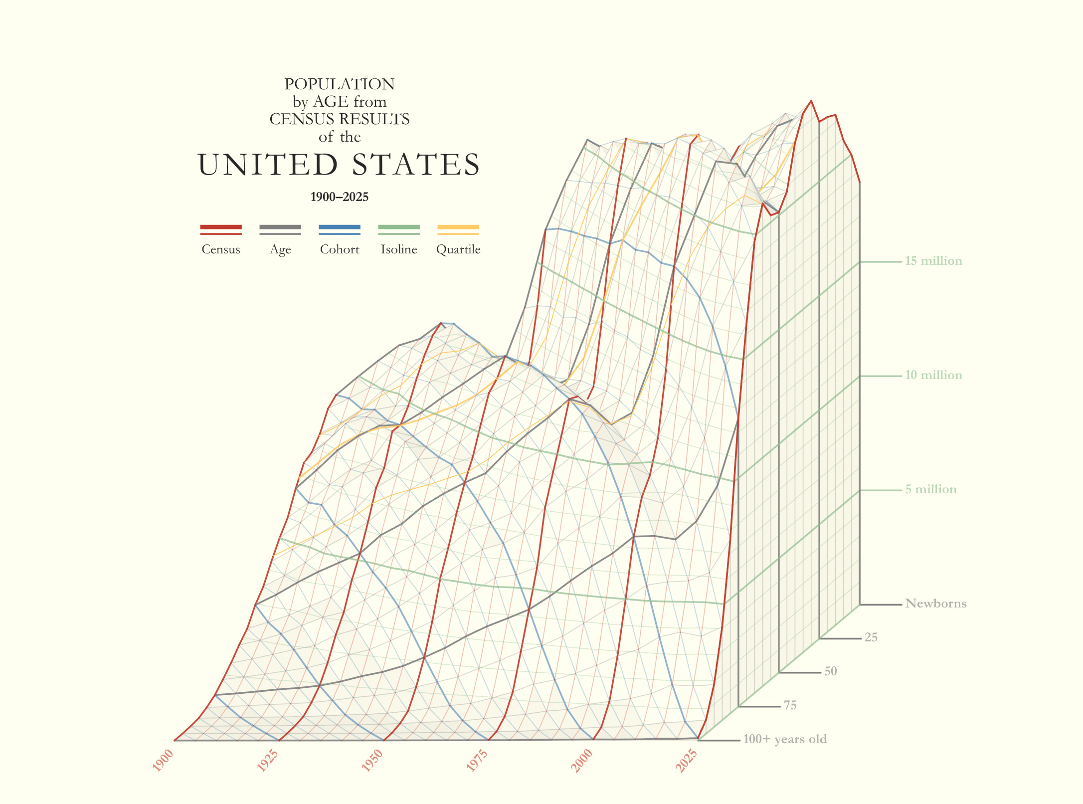 I find that the stereogram’s perspective and overall rise in population make these quantiles hard to read. For example, the yellow line in the foreground advances forward in age in the data, starting well below fifty-years-old in 1900 and ending above fifty by 2025. However, it optically moves backwards in the graphic.