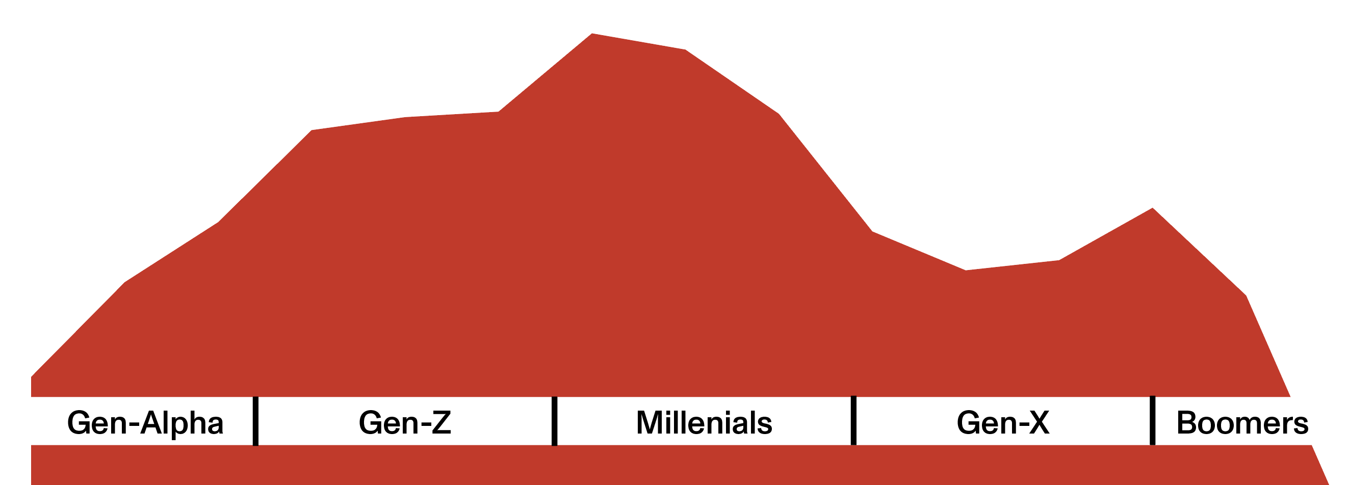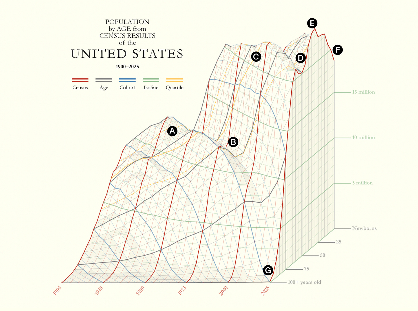 Reading the top ridge of 2025, detailed below, shows us that named generations are more than just marketing speak. Unique peaks and valleys suggest that our population composition will keep changing over time—and with it the composition of our interests and needs.
