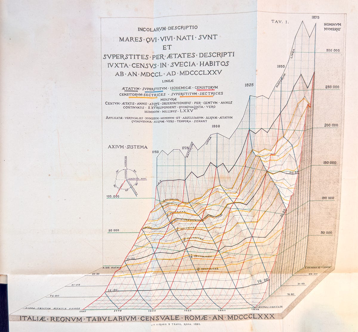 In addition to being published in Latin, because he was sending copies to other national statistical offices, Perozzo’s second design boasted two new colors: golden yellow and orange. They are his attempt to make his stereogram more useful.