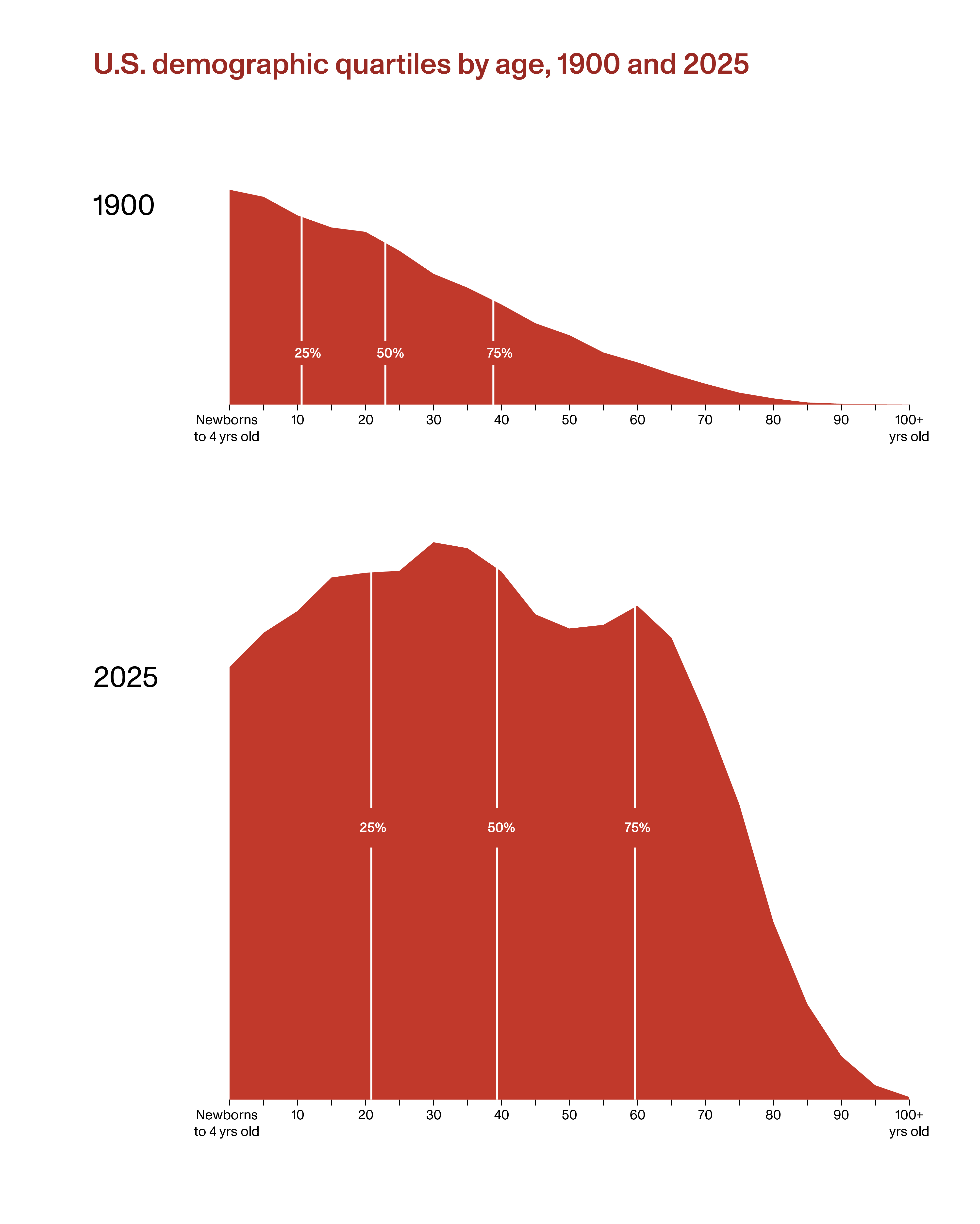 Remember, each is showing the character of the population in a given year, not the survivorship of a particular birth cohort. Seeing 1900 and 2025 like this advance three critical observations (beyond the fact that the second shape is much bigger because our total population is bigger):